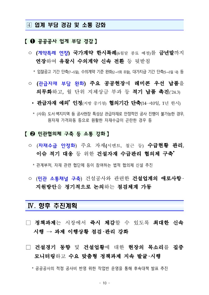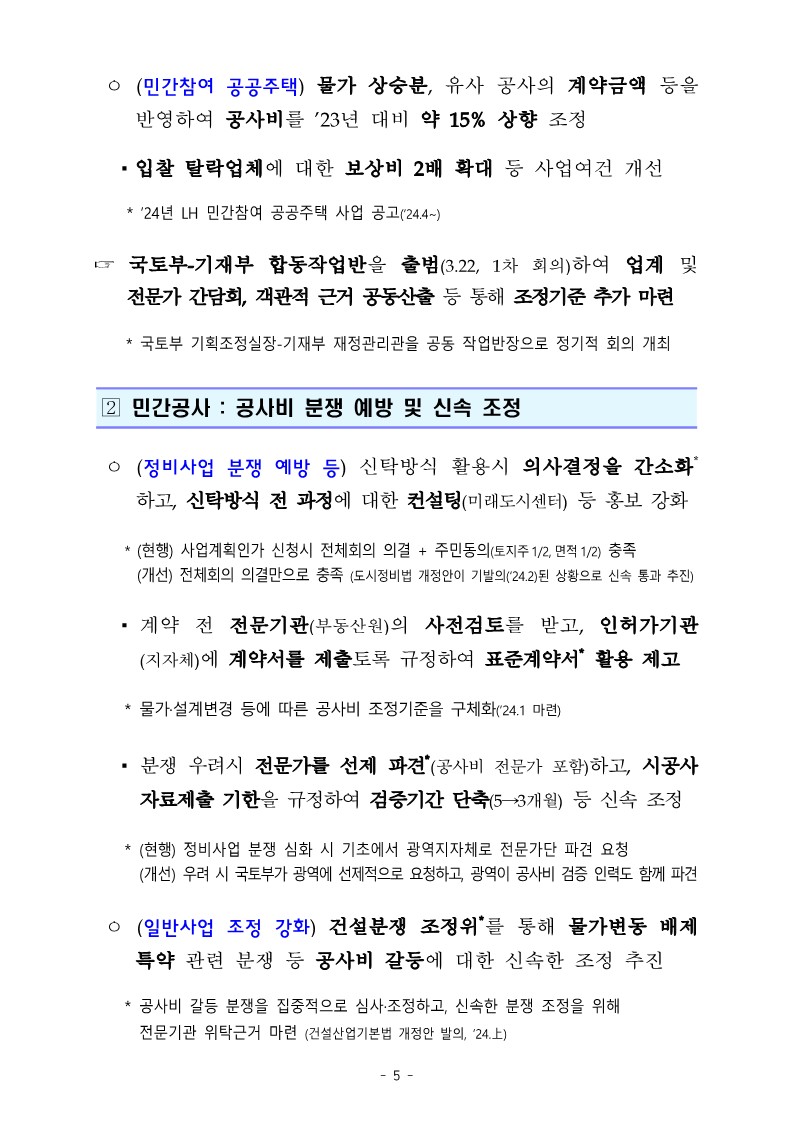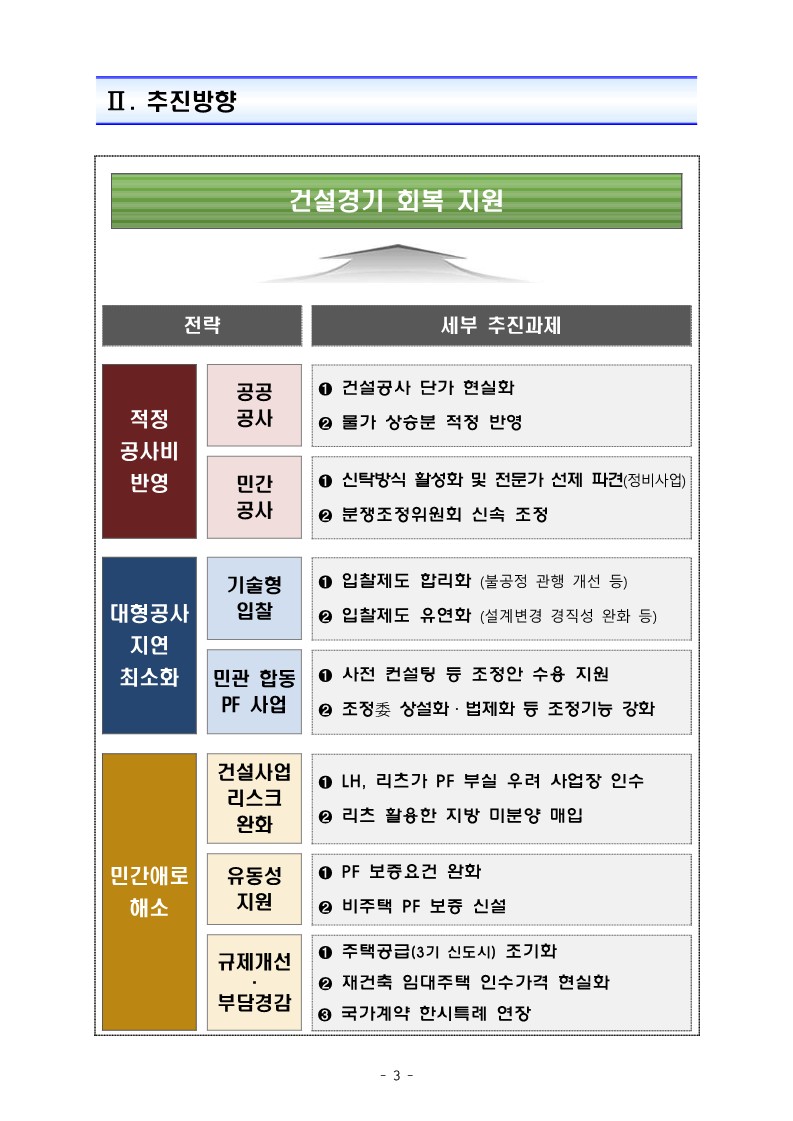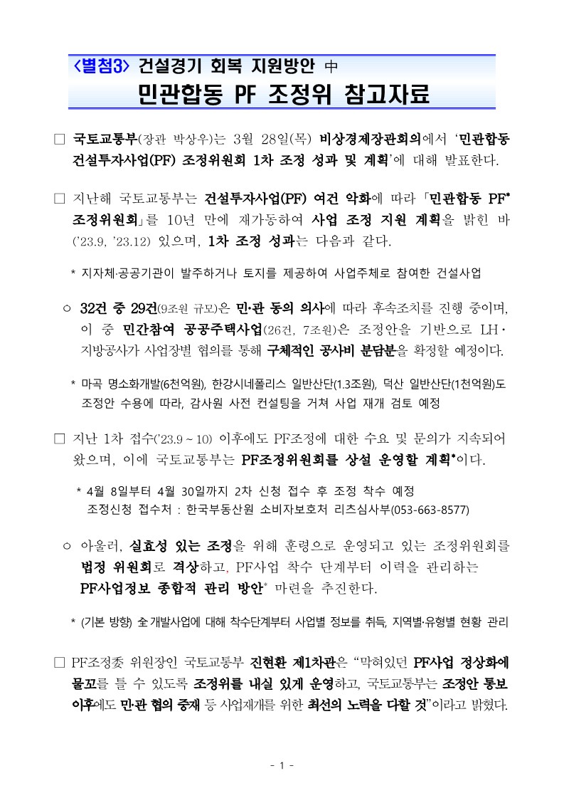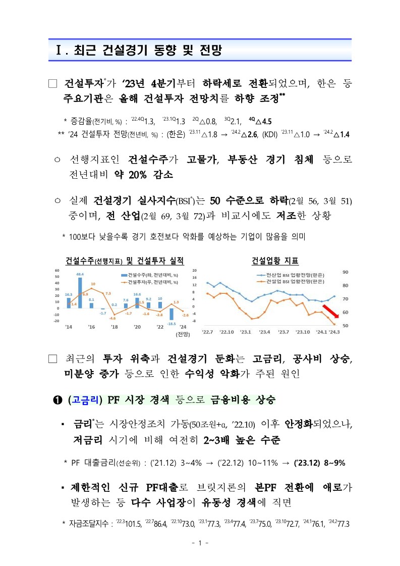 국토교통부는 지난 2024년 3월 28일에 적정 공사비 반영, 대형공사 유찰방지, 미분양 해소 및 각종 규제 개선 등을 골자로 한 건설경기 회복 지원 방안을 발표하였습니다.