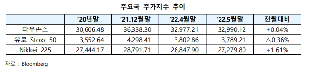 - 5월 주요국 증시는 경기에 대한 불안 심리로 월 전반 약세를 보이다 월 후반 반등하며 전월말 수준에서 마감하였으며, 6월에는 각국의 긴축 진행강도 및 인플레이션 추이에 따른 변동성이 지속될 전망