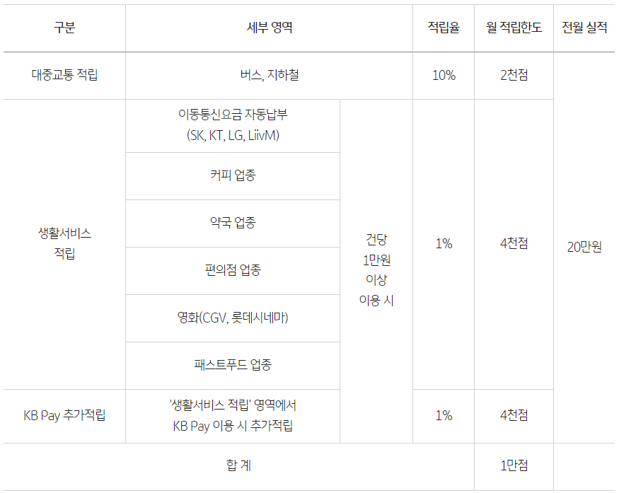 ● '생활서비스 할인' 에서 KB Pay이용시 추가 1% 적립(월 적립한도 4천점)