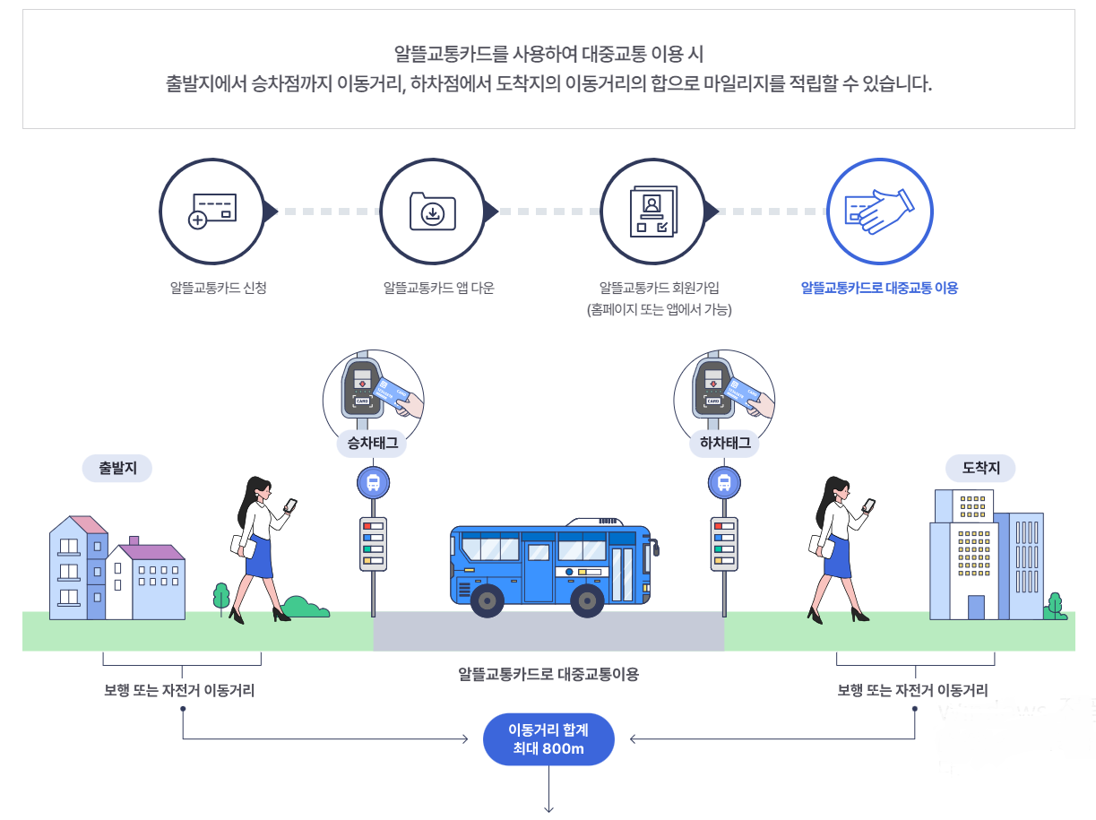 알뜰교통카드는 대중교통을 이용하기 위해 이동한 거리만큼 마일리지로 적립해서 교통비를 줄여주는 방식입니다!