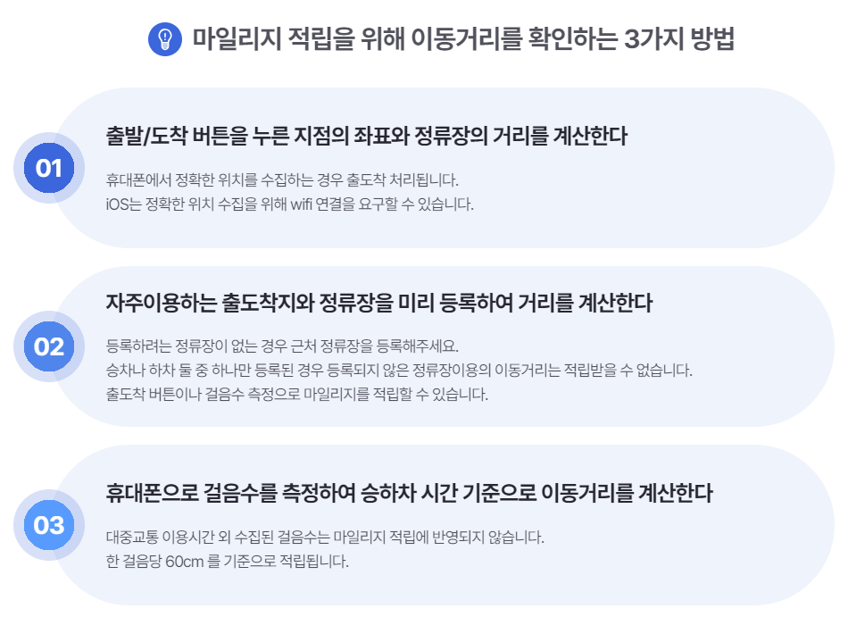 마일리지 적립은 대중교통 1회 이용시 이동거리 최대 800m까지 인정/ 월 15회 미만 이용시 적립액은 소멸됩니다!