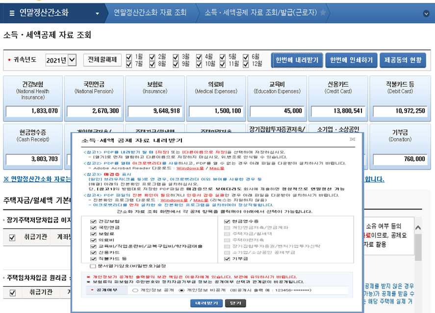 (2) 소득.세액공제자료 내려받기 또는 인쇄하기