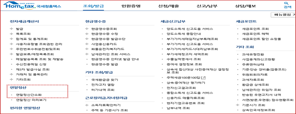 홈택스(www.hometax.go.kr)에 접속하여 홈택스 메뉴 중 [조회/발급] → [연말정산 간소화]를 클릭!