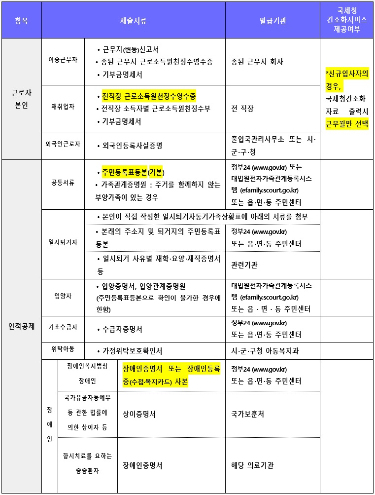 인적공제를 적용받거나 각종 소득공제 및 세액공제를 적용 받기 위해서는 해당 요건을 충족하는지 증명할 수 있는 필수 서류들이 필요합니다.