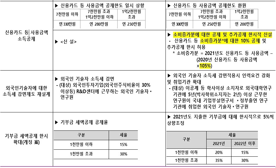2) 소비증가분에 대한 공제 및 추가공제를 한시적으로 신설하여 2021년도에 2020년 신용카드 등 사용금액의 105%를 초과하여 사용한 금액에 대해서 10% 추가공제하도록 하였습니다.
