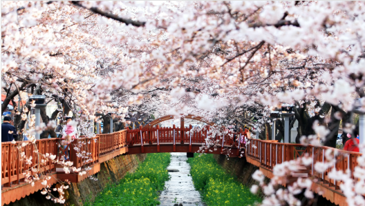 여좌천은 진해 벚꽃의 대표 명소로, 벚꽃이 흐드러지게 핀 천변을 따라 산책하며 낭만적인 분위기를 만끽할 수 있습니다. 특히 로망스다리는 연인들에게 인기있는 포토존으로 벚꽃 터널과 함께 사진을 찍기 가장 좋은 장소로 유명합니다.